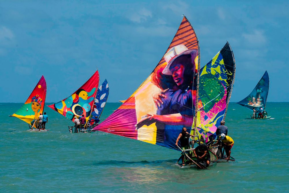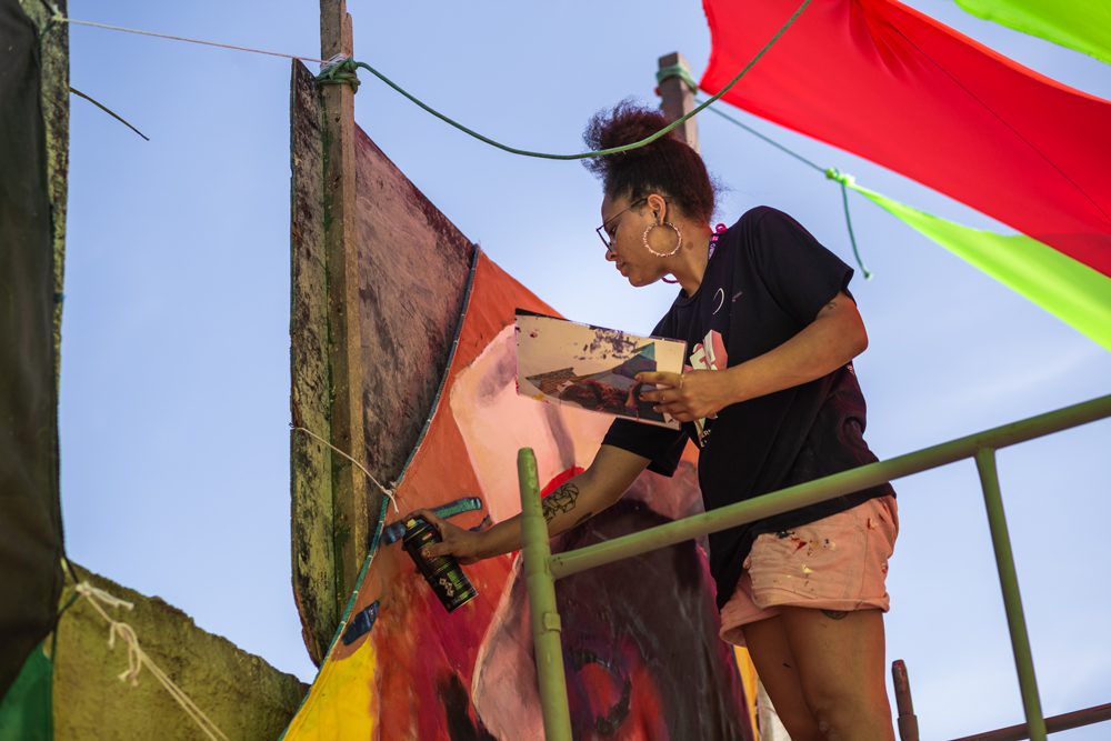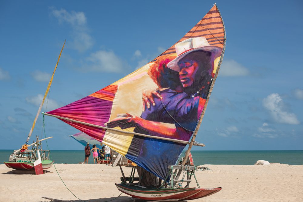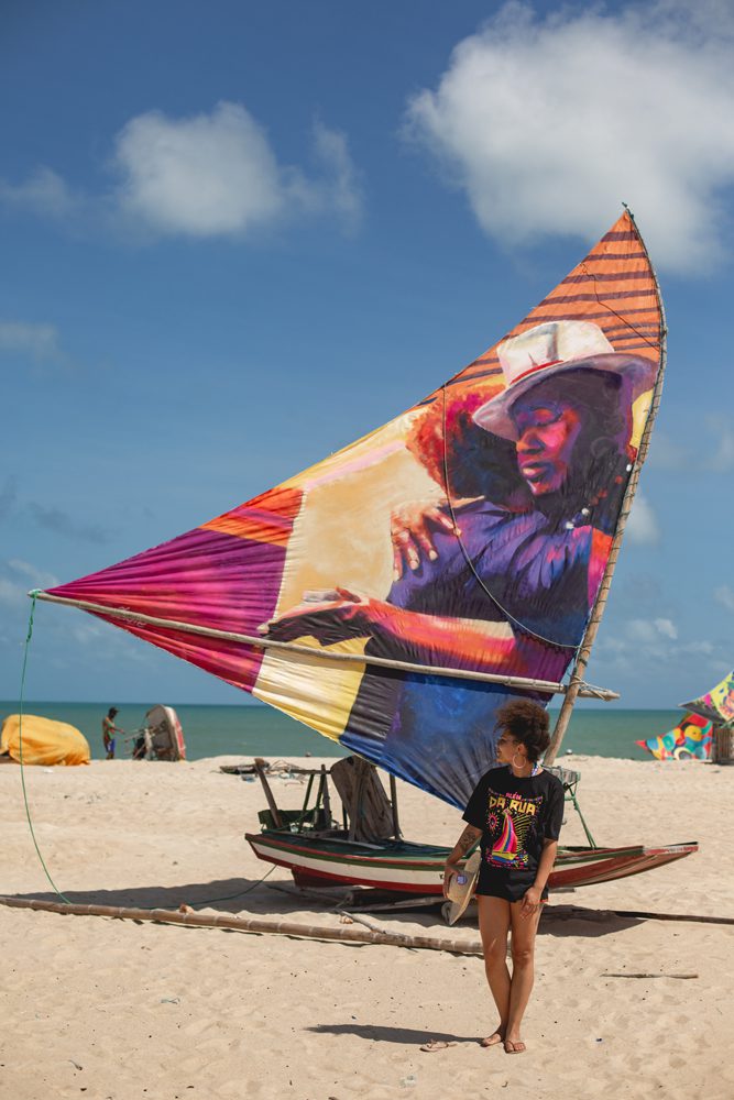 Gugie Cavalcanti participa de Festival Internacional de Arte Urbana, no Ceará, e pinta vela de jangada de um pescador local