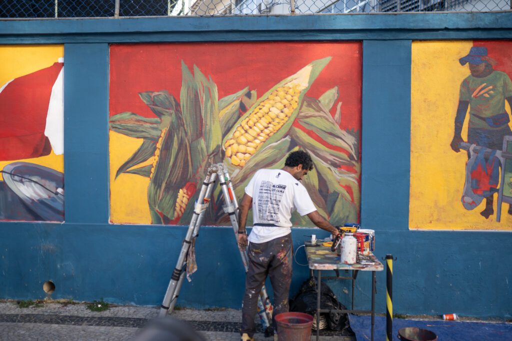 O artista prolonga esse diálogo no mural executado no Rio de Janeiro, intitulado “Sustento à Vida”. Desta vez, o milho assume o posto de protagonista, estabelecendo um elo entre as raízes indígenas latino-americanas, comuns às duas nações. Cultivado há milênios, o “maíz” é visto como fonte de nutrição e riqueza, tendo chegado ao território brasileiro pela Amazônia Ocidental e encontrando, na Colômbia, solo fértil para o seu desenvolvimento. Por meio da imagem de um vendedor de milho a circular pelas praias de Copacabana, Cazé expõe um cotidiano marcado pelo sol ardente, pela necessidade de sustento e pela dignidade do ofício — aspectos que se conectam às narrativas de trabalho presentes no mural colombiano.