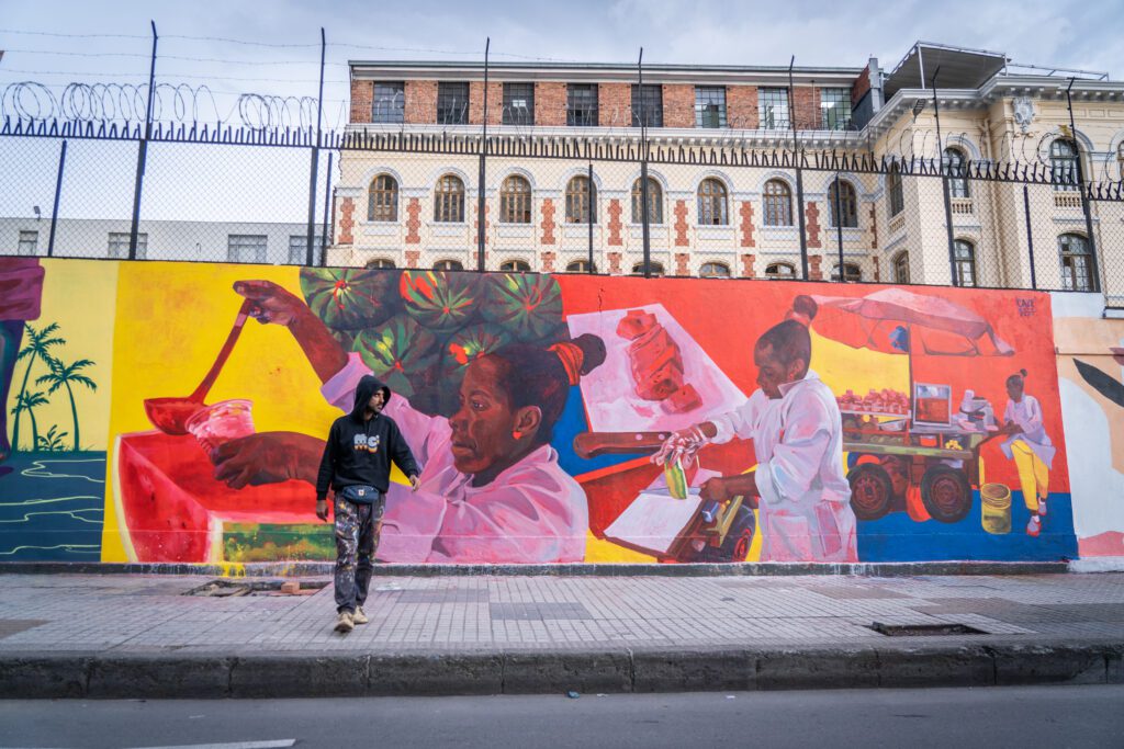 No mural colombiano, Cazé parte do pensamento de Beatriz Nascimento, historiadora e ativista dos direitos de negros e mulheres, para enfatizar o protagonismo do corpo negro feminino em contexto de migração. A figura de Perla, vendedora de frutas em Valle del Cauca, surge como símbolo de resiliência e força, compondo a cena cotidiana de inúmeras mulheres que, em busca de melhores condições de vida, encontram no trabalho a oportunidade de subsistência. Sob tons vermelhos intensos, a obra ilustra os movimentos e expressões de Perla, destacando a potência sociocultural dessas trajetórias frequentemente invisibilizadas. A escolha da personagem e o ambiente urbano reforçam a importância de se enxergar, na rotina mais simples, um espaço de afirmação e resistência.