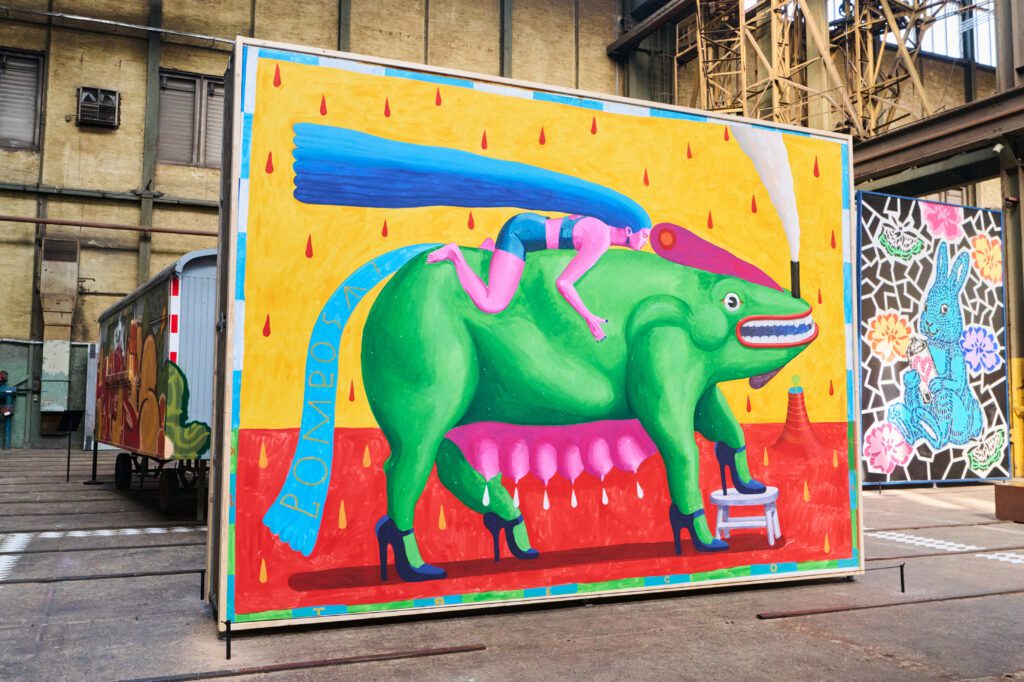 Entre os participantes, Priscila Barbosa e Deco Treco, artistas representados pela Aborda, apresentam obras que evidenciam a diversidade de suas pesquisas dentro do muralismo contemporâneo. Barbosa expõe Volta pro tanque, trabalho que confronta a permanência do machismo na vida cotidiana das mulheres e reflete sobre formas de subversão possíveis a partir do ambiente doméstico. Deco Treco participa com Pomposa, pintura que explora sua linguagem característica, povoada por personagens inesperados e atmosferas abertas à livre associação. O artista também assinou a identidade visual da exposição.