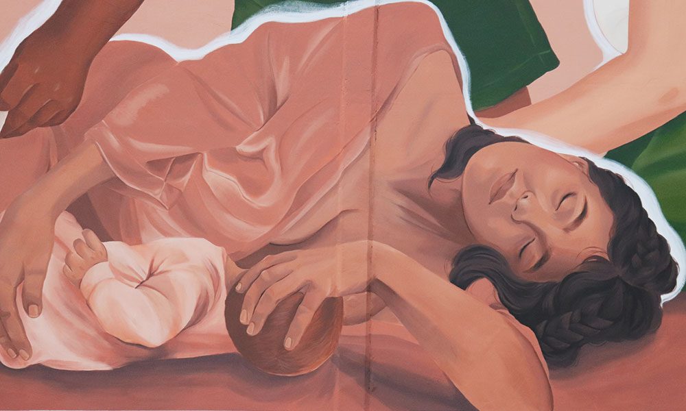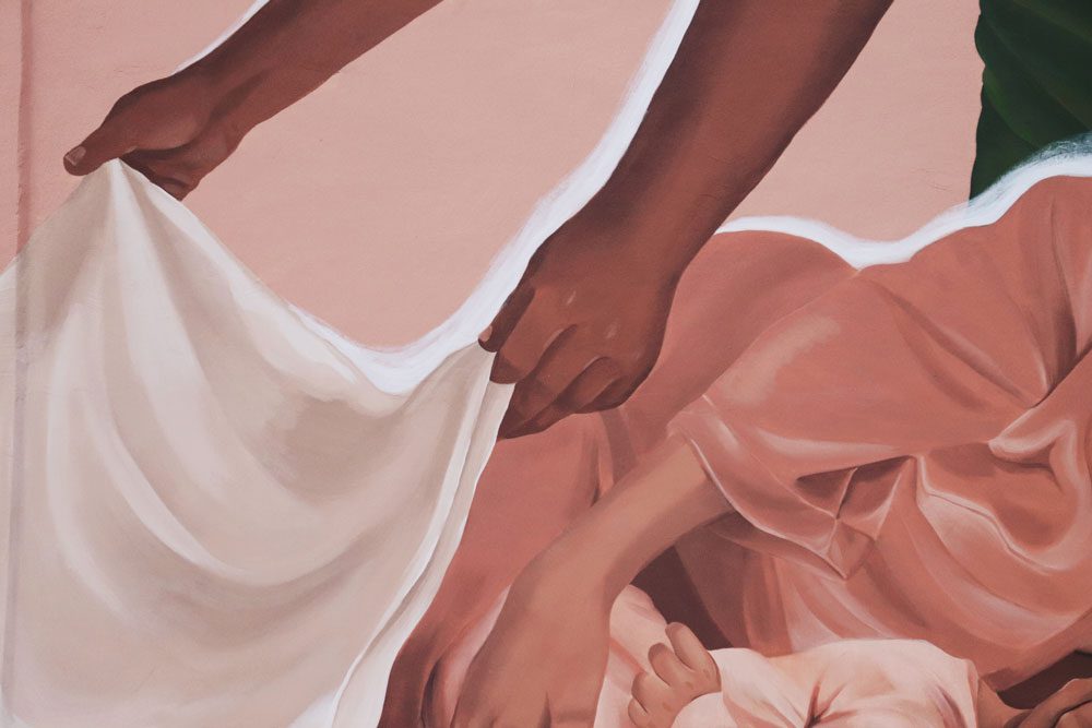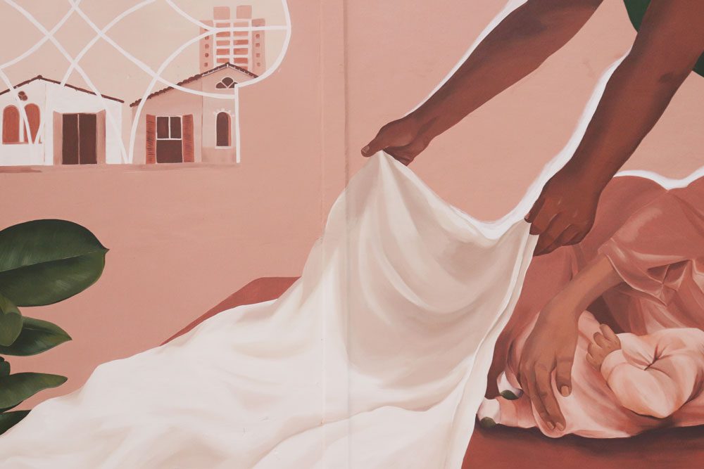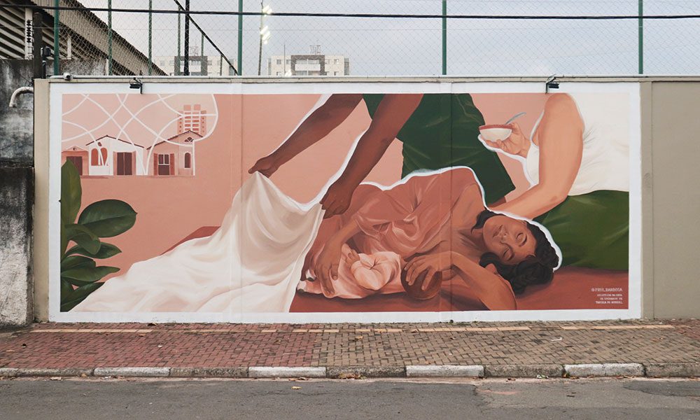 O mural “As Operárias”, desenvolvido pela artista, aborda o trabalho invisível das mulheres. Priscila explica que a criação, o cuidado com as pessoas, o cuidado doméstico, continuam sendo atividades consideradas subalternas e naturais do gênero feminino.