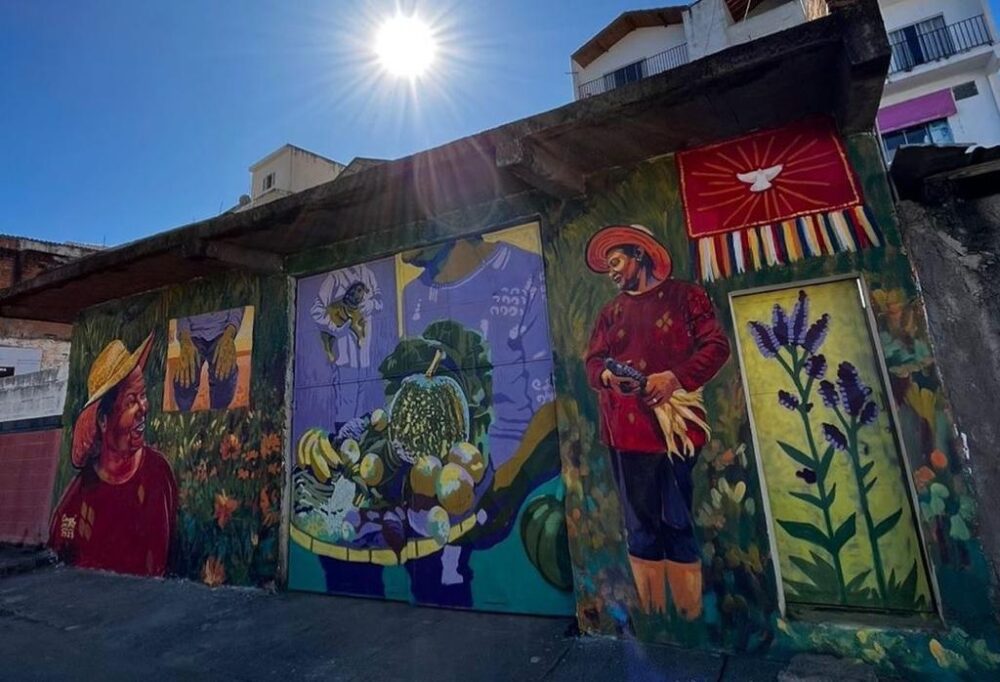 Antes de começar o processo de pintura do mural, o artista pôde ter contato com a agricultora, a cidade e os alunos da escola. A arte, que fica no centro histórico de Cunha, traz o questionamento: O que é a riqueza?