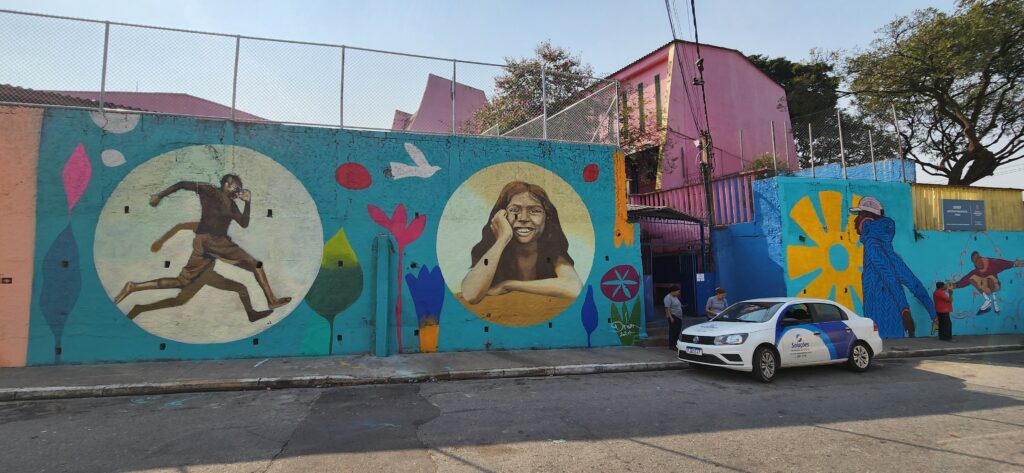 Em agosto, cinco artistas representados pela Aborda — Consp, Luna Bastos, Priscila Barbosa, Jamaira Pacheco e Santiago Panichelli — se reuniram na EMEF Professor Antônio Prudente, na Brasilândia, para uma ação coletiva de pintura. O projeto, que envolveu diferentes técnicas e abordagens estéticas, destacou a importância da colaboração artística e do intercâmbio de experiências entre os participantes.