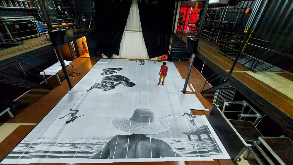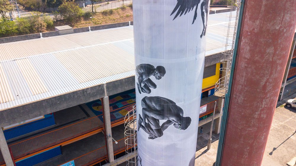 – Em meus trabalhos gosto de ressignificar espaços. Nesta obra quis mostrar como seria o interior de uma caixa d’água, de uma forma lúdica. É como se ali tivesse um universo onde as pessoas estão tomando banho, pulando e brincando. E foi a partir das fotografias do Quirino que criei uma nova composição.