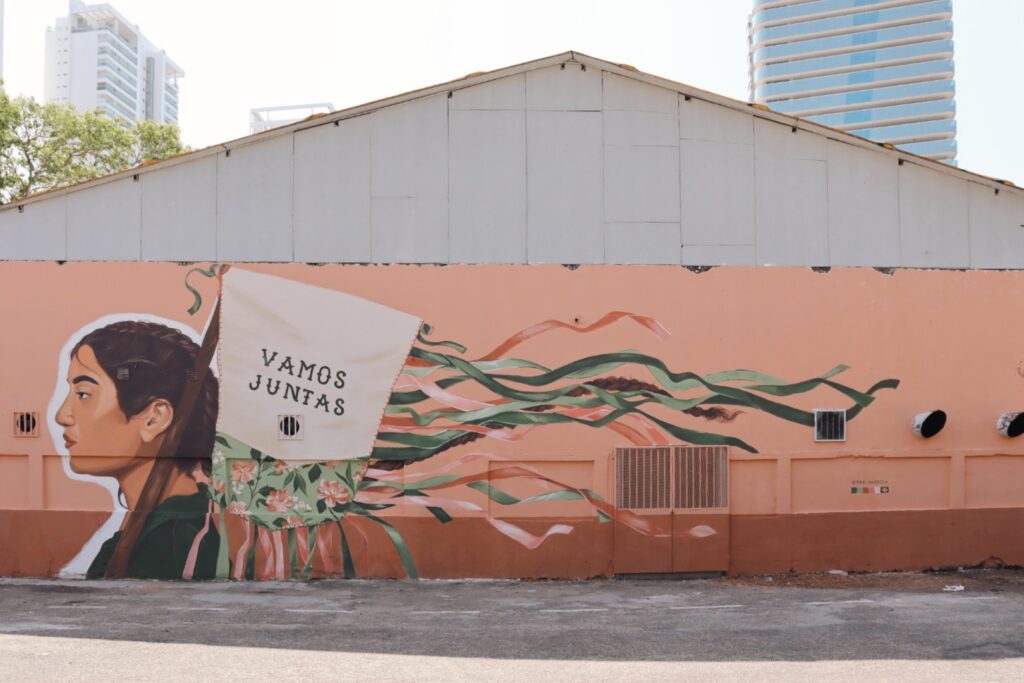 Através do mural intitulado “Vamos Juntas”, Priscila Barbosa busca simbolizar a força e a potência que emergem quando mulheres optam por compartilhar o caminhar, apoiando-se mutuamente.