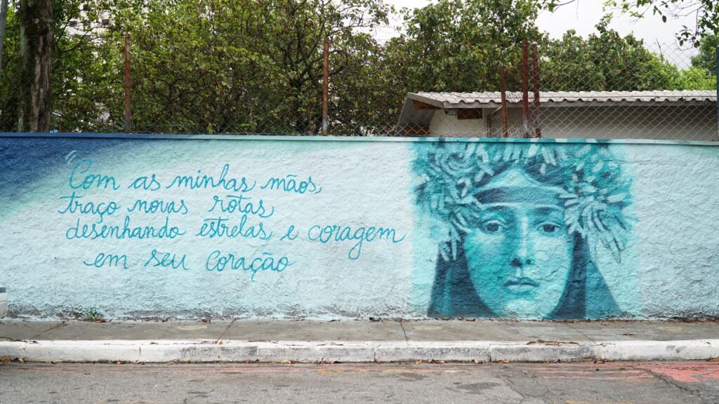 A pintura, intitulada “Nosso Conto”, destaca imagens de escritoras brasileiras que serviram como referência ao longo da trajetória de Jamaira, acompanhadas por um poema autoral da artista: