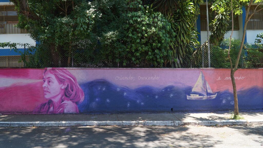 Durante a execução do mural, Thiago Diel capturou imagens para a produção de um mini documentário, no qual a artista explora aspectos-chave de sua jornada e suas fontes de inspiração, refletindo sobre o papel crucial da arte na construção de narrativas coletivas. Assista na íntegra.
