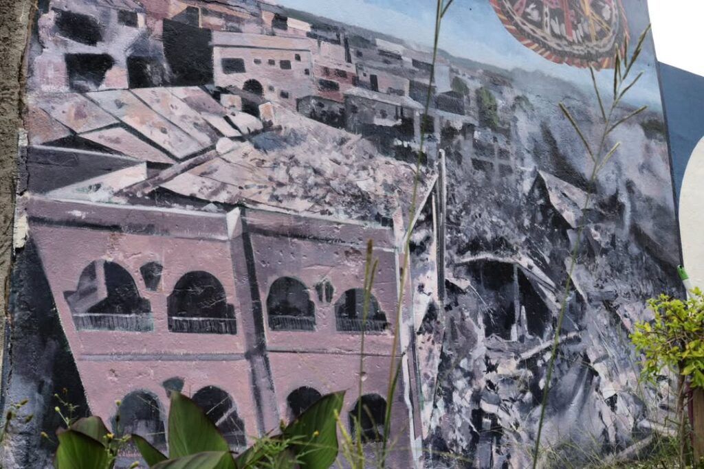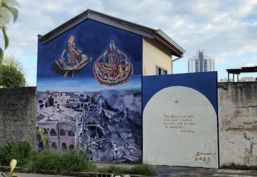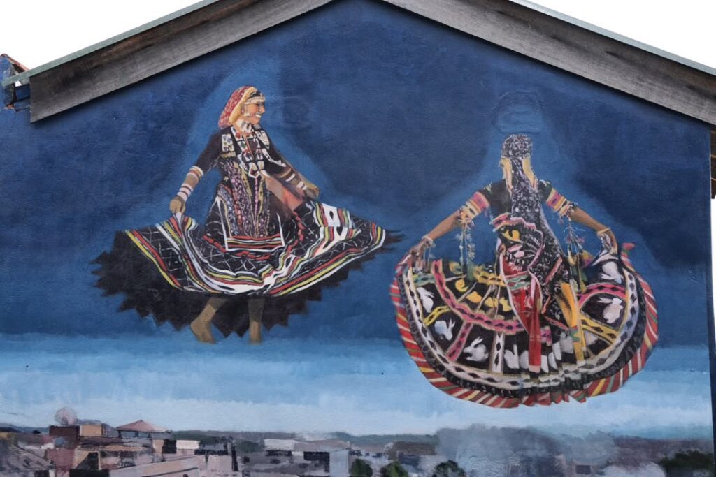 Na composição do mural, a imagem se estrutura em dois planos que dialogam entre si, ainda que à primeira vista pareçam mundos distintos. Acima, figuras enraizadas em sua própria cultura se elevam sobre um fundo etéreo, suas vestes ondulantes evocando o movimento da dança Kalbeliya. São corpos em deslocamento, mas que carregam consigo um pertencimento que não se define por fronteiras geográficas, e sim por laços de memória e tradição. Na parte inferior, uma terra sem dono, bombardeada por aqueles que acreditam ser possível conquistá-la. A relação entre as imagens surgiu depois: sem que houvesse intenção direta, os artistas construíram uma metáfora sobre domínios e fronteiras, sobre aquilo que se tenta capturar, mas escapa.