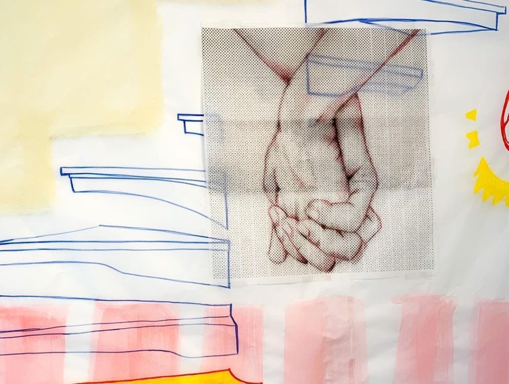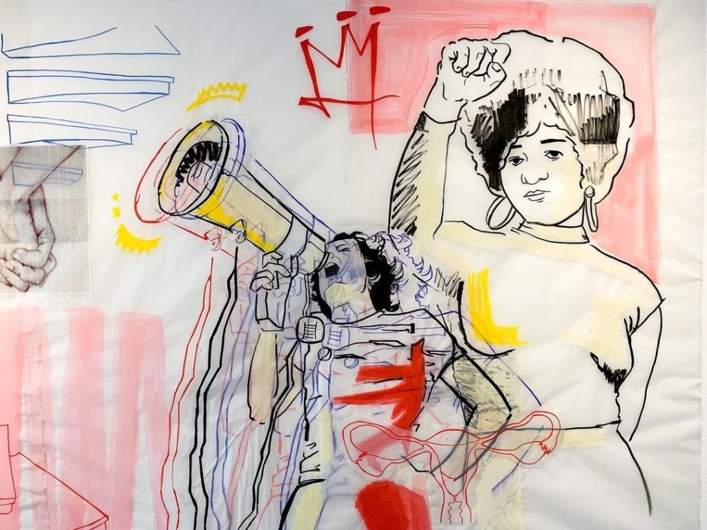 A artista visual agenciada pela Aborda fez a obra “Camadas”. Dolores utilizou técnicas mistas como colagem, pintura com tinta acrílica, marcadores e adesivos sobre papel vegetal. Ela explica que, em sua visão, as conquistas das mulheres são recentes e portanto podem ser  frágeis, assim como o suporte do trabalho.
