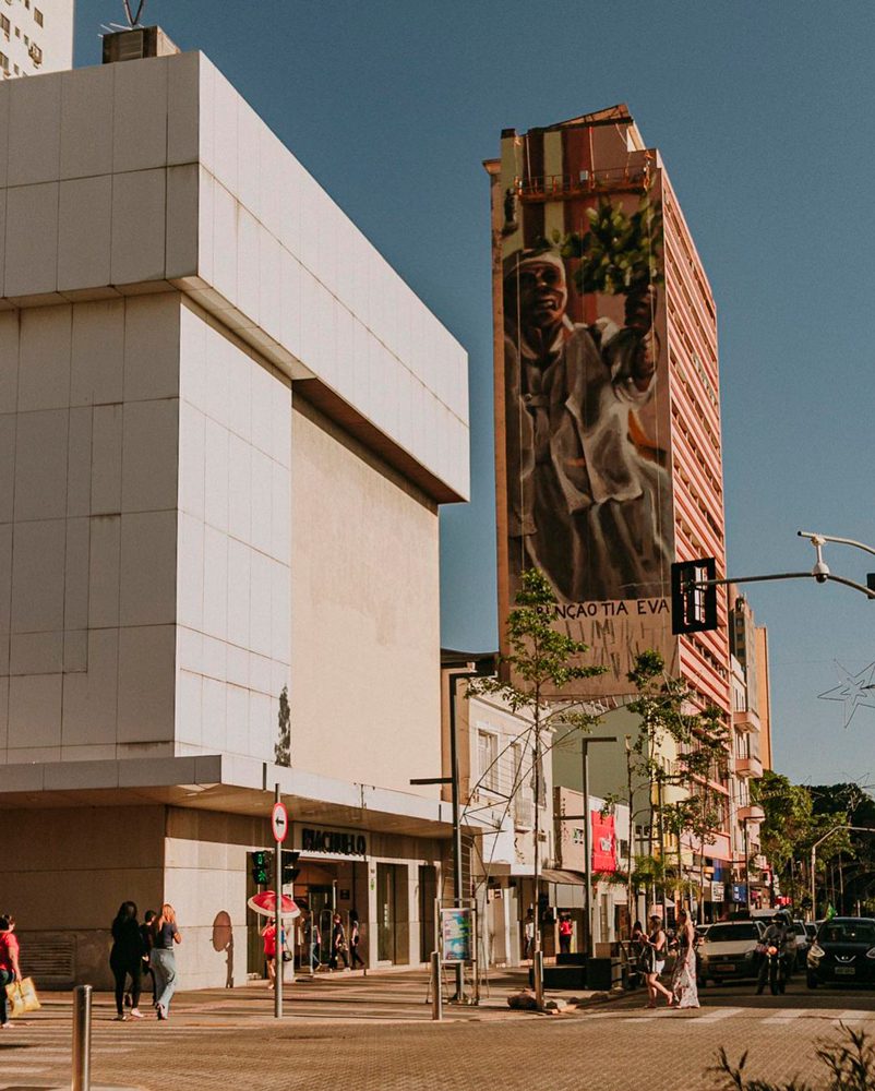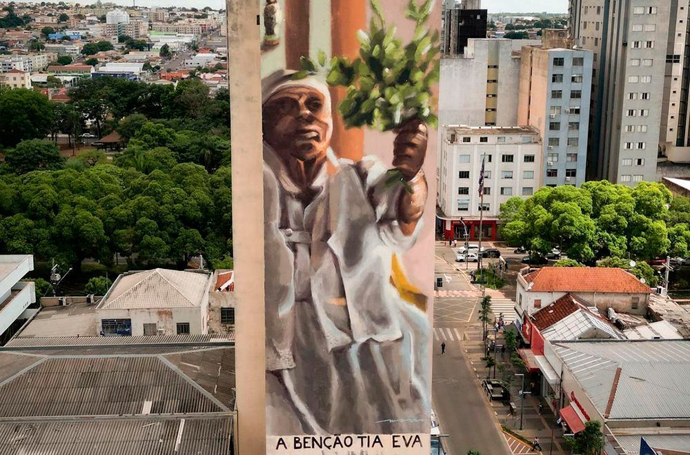 Em 2022, nosso artista representou uma das personalidades importantes de Campo Grande, no Mato Groso do Sul. Tia Eva teria sido uma das primeiras pessoas a iniciar o processo de ocupação da cidade. Ergueu uma igreja em homenagem a São Benedito e, ao entorno, criou um quilombo para honrar a promessa e agradecer por ter encontrado um chão fértil para se enraizar. Ela manteve a tradição de festejar anualmente o único santo preto católico, festa que se mantém na comunidade a mais de 100 anos