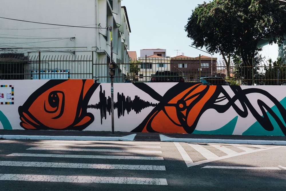 – Utilizei os peixes para simbolizar os diferentes blocos econômicos nadando juntos na mesma direção. A escada é sobre o acesso para todos e a espinha do peixe é o gráfico de um áudio com a frase “Somos todos um”.